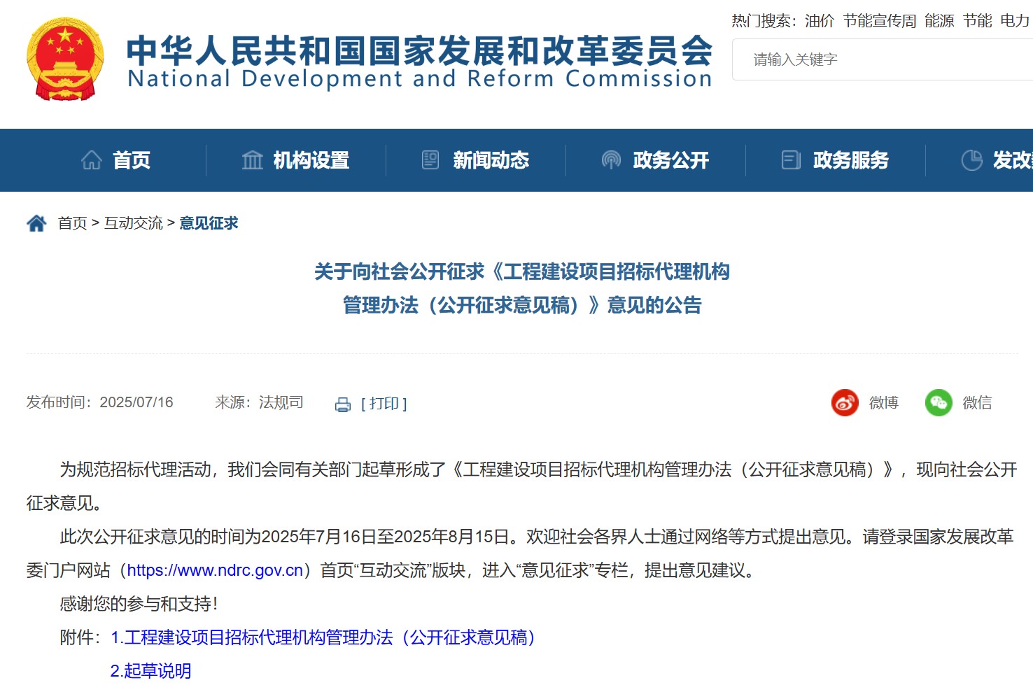 為規(guī)范招標代理活動,國家發(fā)展和改革委員會會同有關部門起草形成了《工程建設項目招標代理機構管理辦法(公開征求意見稿)》,現(xiàn)向社會公開征求意見。此次公開征求意見的時間為2025年7月16日至2025年8月15日。