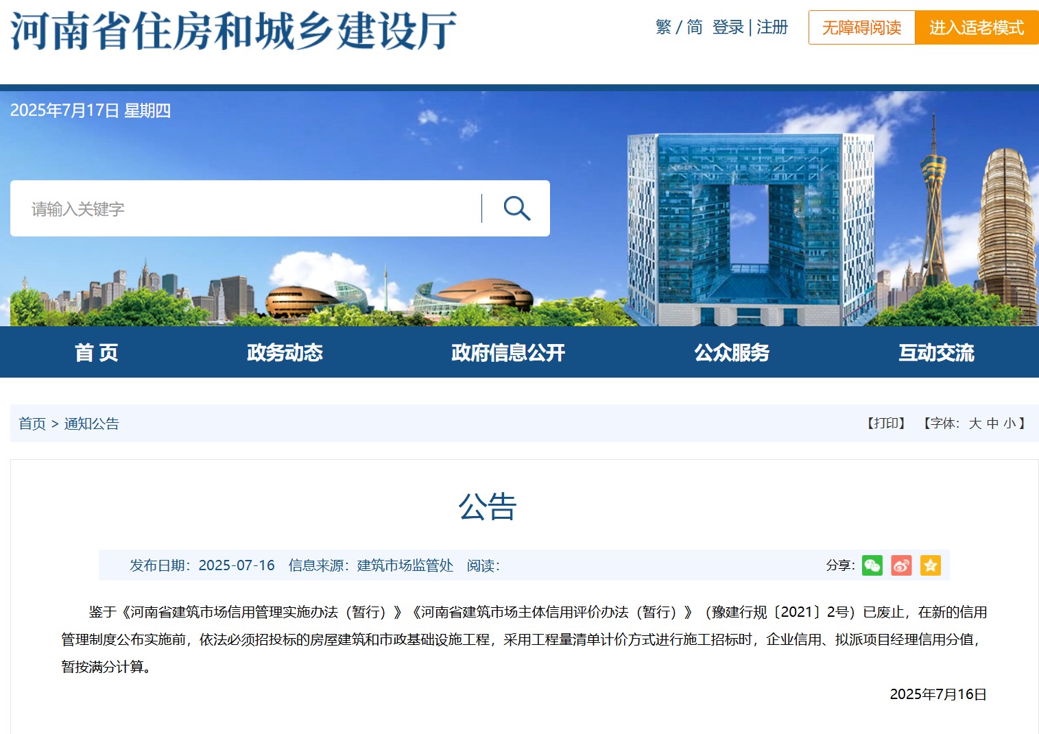 河南省住建廳發(fā)布關于房建、市政施工項目招標時信用分計算的公告